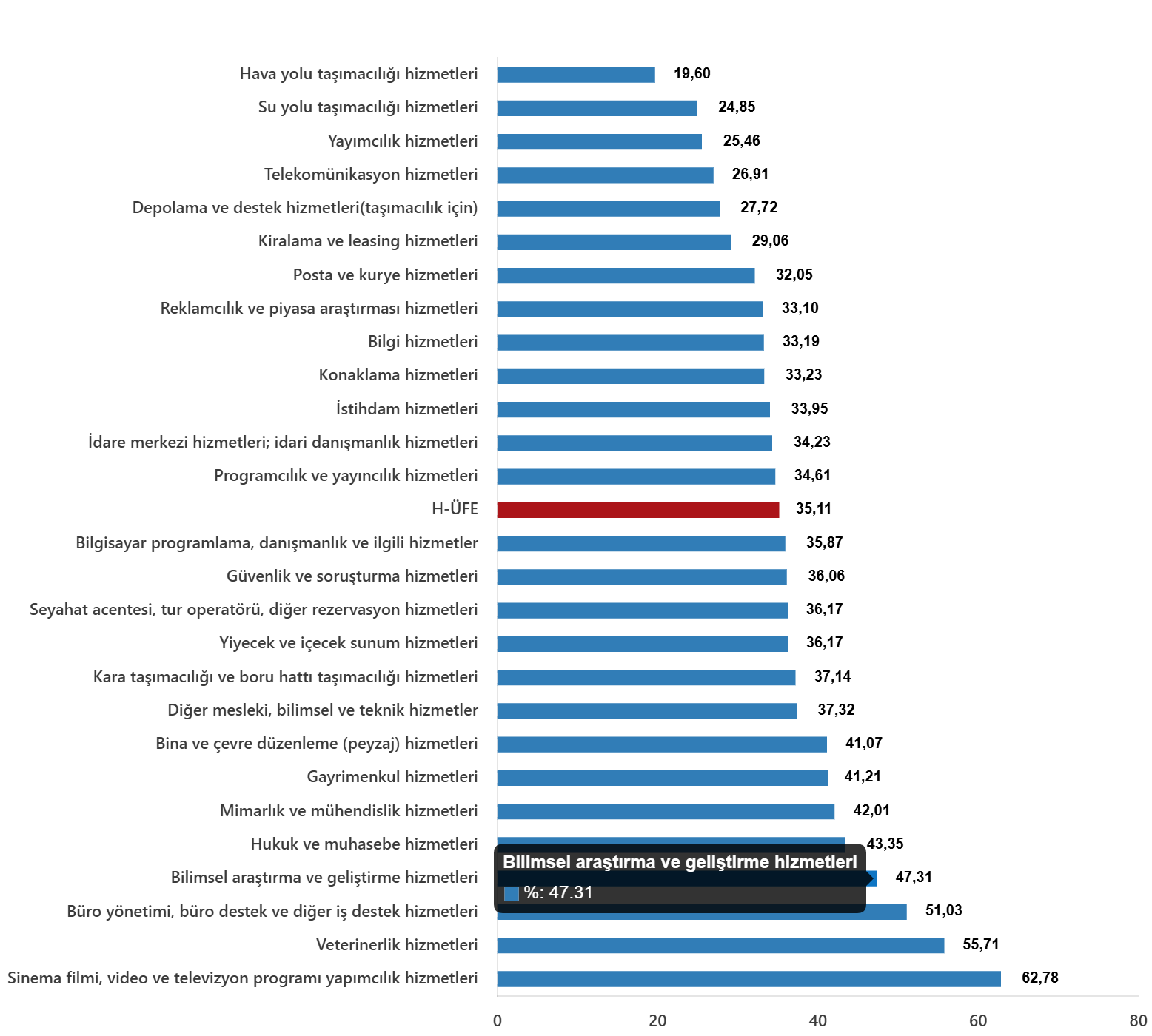 Bir evvelki yılın tıpkı ayına nazaran, ulaştırma ve depolama hizmetlerinde %32,32 artış, konaklama ve yiyecek hizmetlerinde %35,46 artış, bilgi ve irtibat hizmetlerinde %34,32 artış, gayrimenkul hizmetlerinde %41,21 artış, mesleksel, bilimsel ve teknik hizmetlerde %40,33 artış, idari ve dayanak hizmetlerde %37,92 artış gerçekleşti.