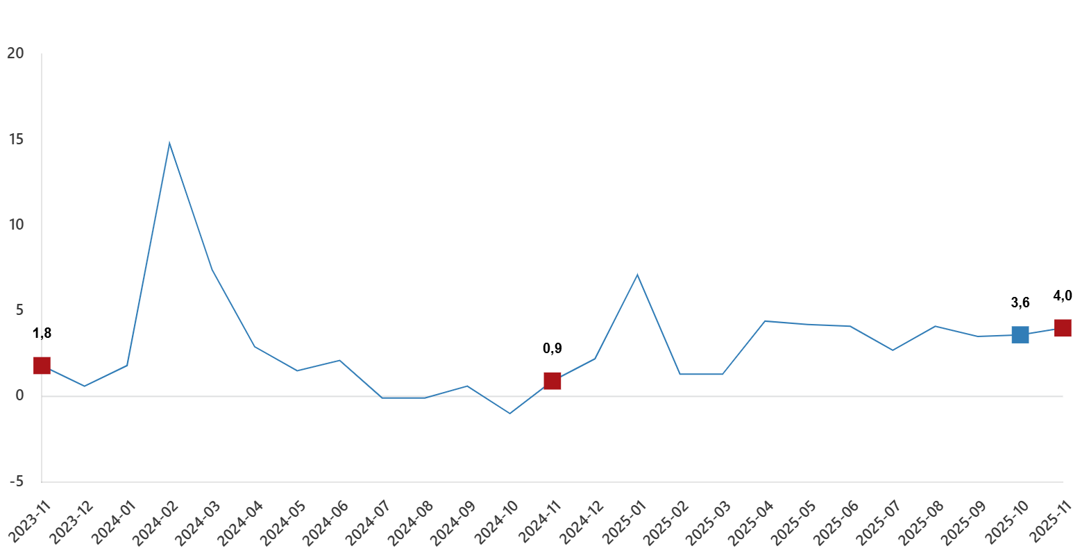 Hizmet üretim endeksi (2021=100) 2025 yılı Kasım ayında bir evvelki yılın birebir ayına nazaran %4,0 arttı. Tıpkı ayda ulaştırma ve depolama hizmetleri %1,6 arttı, konaklama ve yiyecek hizmetleri %7,2 arttı, bilgi ve bağlantı hizmetleri %8,7 arttı, gayrimenkul hizmetleri %3,0 arttı, mesleksel, bilimsel ve teknik hizmetler %1,7 arttı, idari ve takviye hizmetleri ise %5,1 arttı.