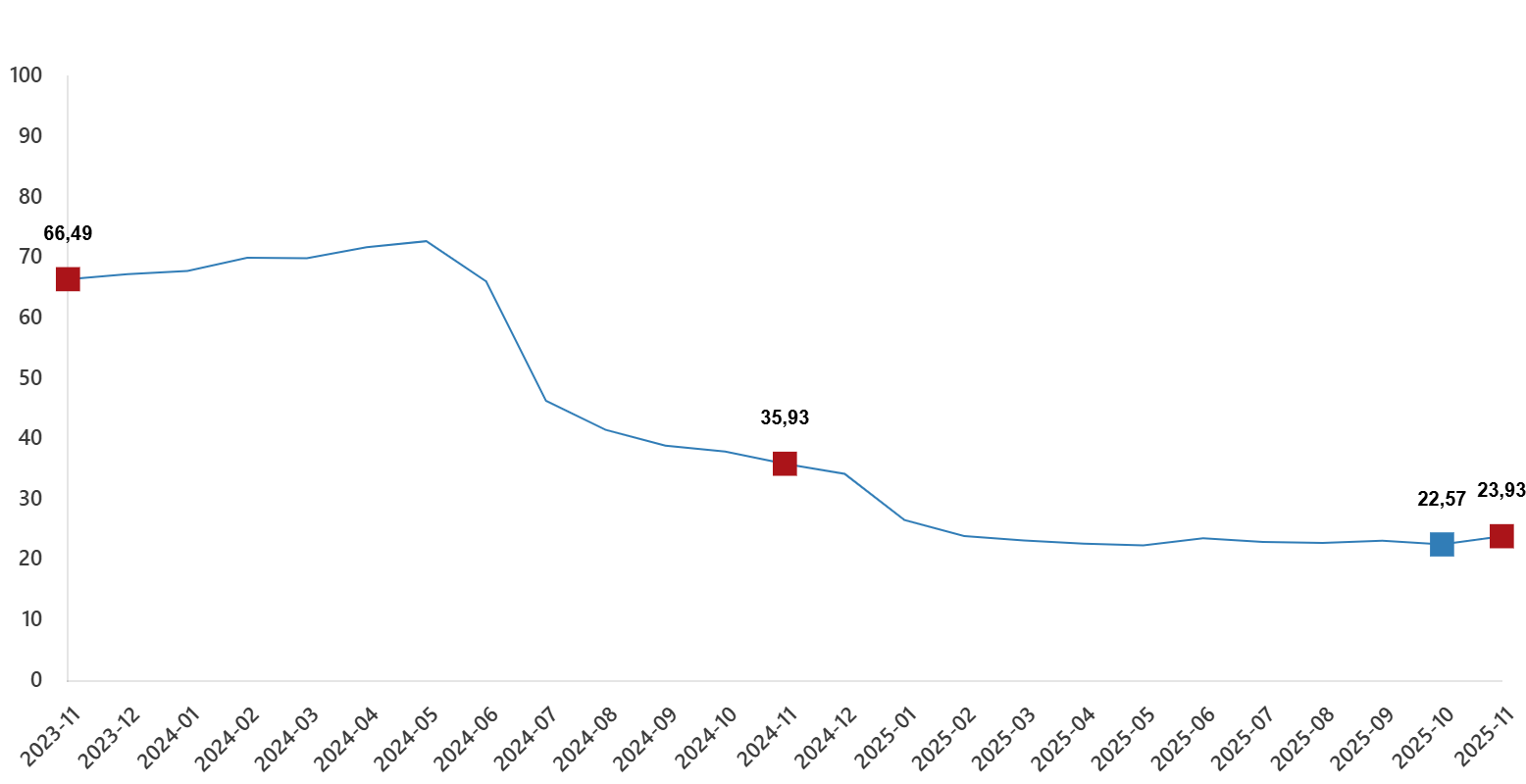 İnşaat maliyet endeksi, 2025 yılı Kasım ayında bir evvelki aya nazaran %1,14 arttı, bir evvelki yılın tıpkı ayına nazaran %23,93 arttı. Bir evvelki aya nazaran materyal endeksi %1,70 arttı, personellik endeksi %0,12 arttı. Ayrıyeten bir evvelki yılın birebir ayına nazaran materyal endeksi %20,48 arttı, personellik endeksi %30,98 arttı.