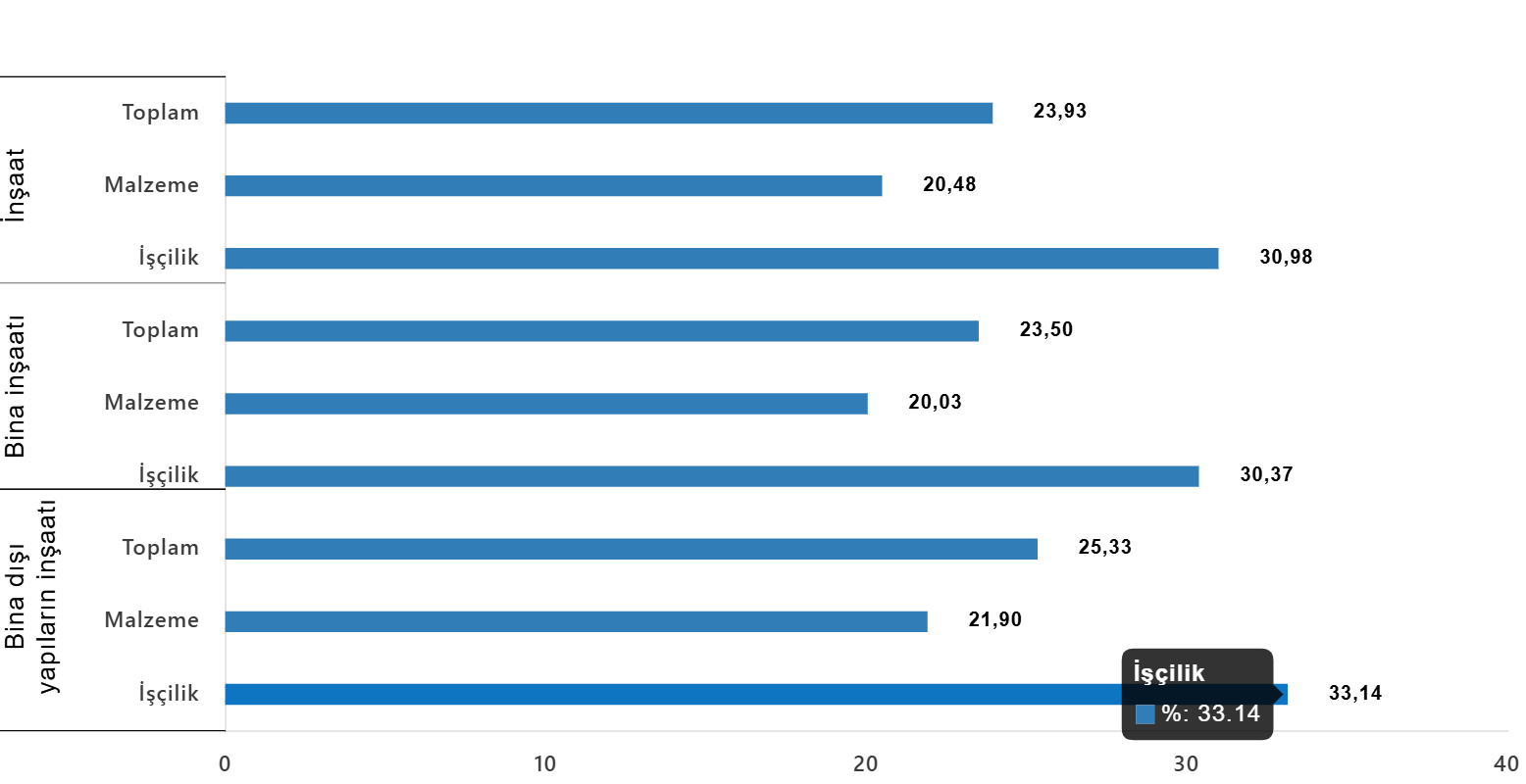 Bina inşaatı maliyet endeksi, bir evvelki aya nazaran %1,14 arttı, bir evvelki yılın tıpkı ayına nazaran %23,50 arttı. Bir evvelki aya nazaran materyal endeksi %1,69 arttı, personellik endeksi %0,17 arttı. Ayrıyeten bir evvelki yılın tıpkı ayına nazaran materyal endeksi %20,03 arttı, personellik endeksi %30,37 arttı.