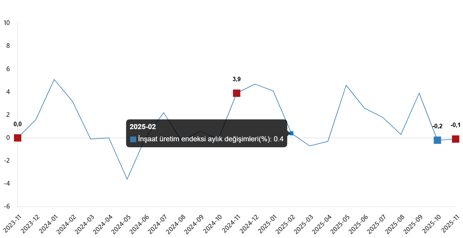 İnşaatın alt dalları incelendiğinde, 2025 yılı Kasım ayında bina inşaatı bölümü endeksi bir evvelki aya nazaran %0,3 arttı, bina dışı yapıların inşaatı bölümü endeksi %0,4 arttı ve özel inşaat faaliyetleri bölümü endeksi %1,8 azaldı.