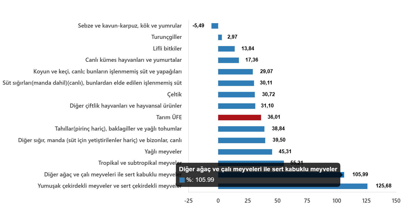 Yıllık değişimin en yüksek olduğu alt küme %125,68 artış ile yumuşak çekirdekli meyveler ve sert çekirdekli meyveler, aylık değişimin en yüksek olduğu alt küme %22,27 artış ile zerzevat ve kavun-karpuz, kök ve yumrular oldu.